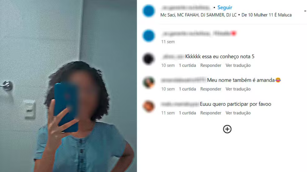 Ao som do funk “Piranha, safada, brotou pro combate”, um post público no TikTok mostra um vídeo de uma brasileira de 11 anos sorrindo para a câmera. No Instagram, a trilha sonora da foto de outra menina, de 9 anos, é “Então, vem, vem, b*c*ta criminosa. Eu sei que eu sou feio, mas é só [de] fuzil que tu gosta”.